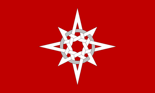 The Proninists wear armor or other clothing with a mix of black and red. Their flag is a white compass rose on a field of red.